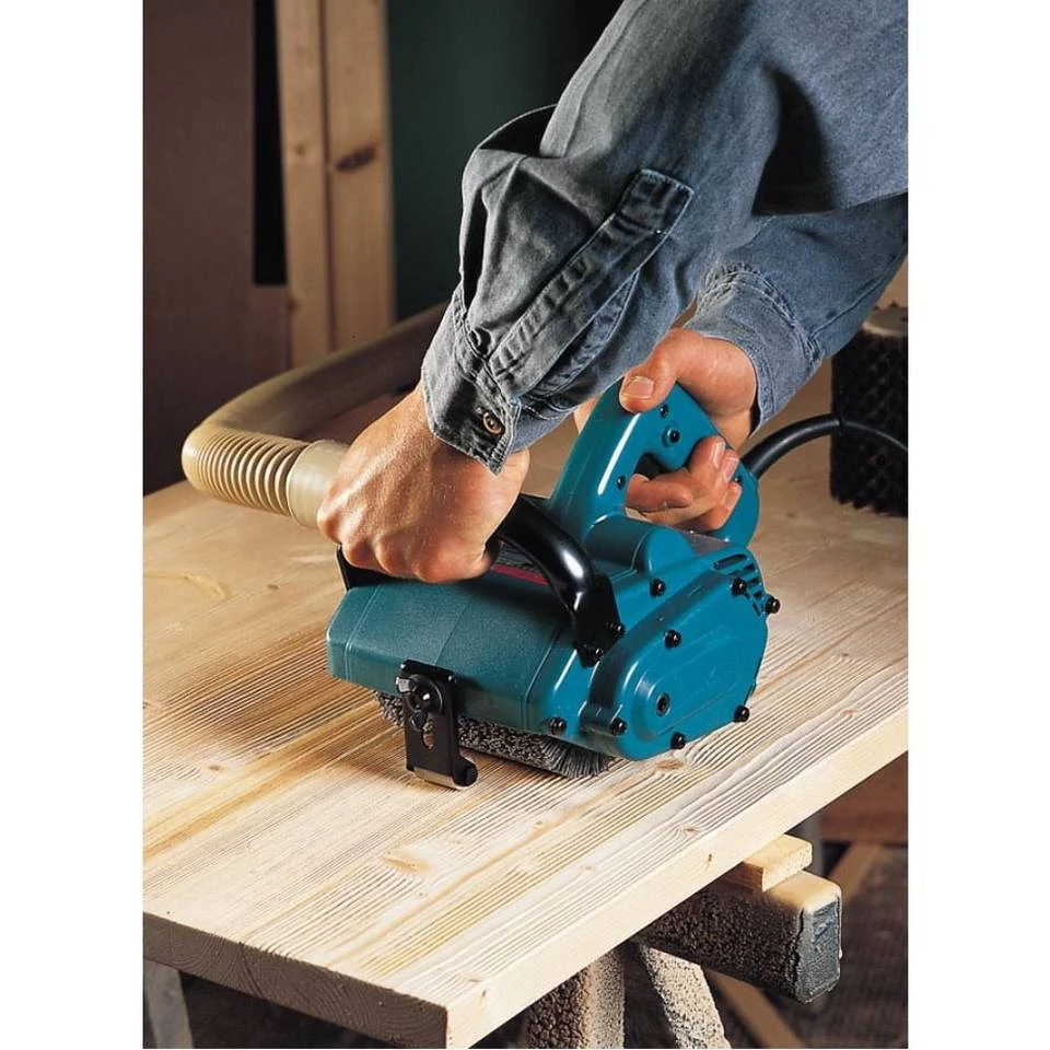 Die 100 x 120 Millimeter messenden Bürsten können in frei einstellbarer Schleiftiefe an den zu bearbeitenden Materialien angesetzt und zudem auch leicht gewechselt werden. Der MAKITA Bürstenschleifer 9741J arbeitet mit einer zuverlässigen Motorbremse und kann zudem auch mit einer komfortablen Staubabsaugung zusätzlich ausgestattet werden. Besonders einfach wechseln Sie beim MAKITA Bürstenschleifer 9741J die Bürsten, denn hierfür müssen Sie weder große Mühe aufwenden noch Werkzeuge nutzen. Ebenfalls unkompliziert erfolgt die Reinigung des Bürstenschleifers mithilfe von Luftdruck oder eines Pinsels.