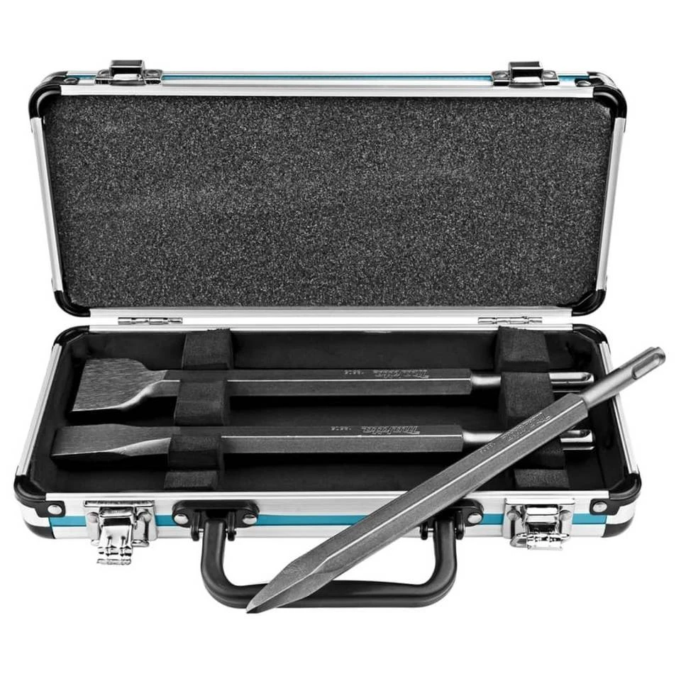 Im Lieferumfang sind 3 Stk. SDS-PLUS Meißel enthalten. Alle Werkzeuge werden in einem handlichen Aluminium-Koffer mit Schloss und Griff zur Aufbewahrung und zum Schutz geliefert. Sein robustes Inneres und sein Organizer helfen, Werkzeuge an Ort und Stelle zu halten.