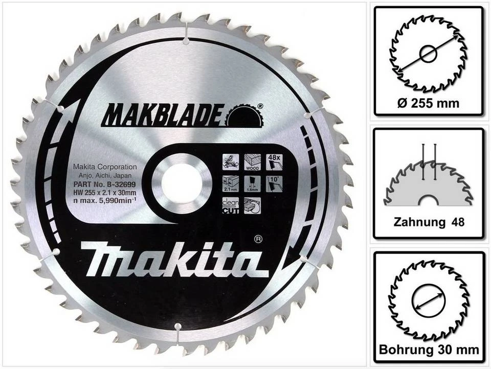 - Zähnezahl: 48Bohrung: 30 mm Durchmesser: 255 mmZahnwinkel: 10°Max. Drehzahl: 5.990 min-1Geeignet für: