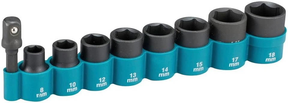 - Acht Steckschlüssel mit 3/8“-Vierkantaufnahme in den Größen 8, 10, 12, 13, 14, 15, 17, 18 mm.
